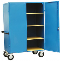 Cette armoire est disponible soit grillagée, soit métallique. Elle est équipée de 4 roues, dont 2 pivotantes, et de 3 ou 4 étagères. Livrée de série avec une barre de poussée.